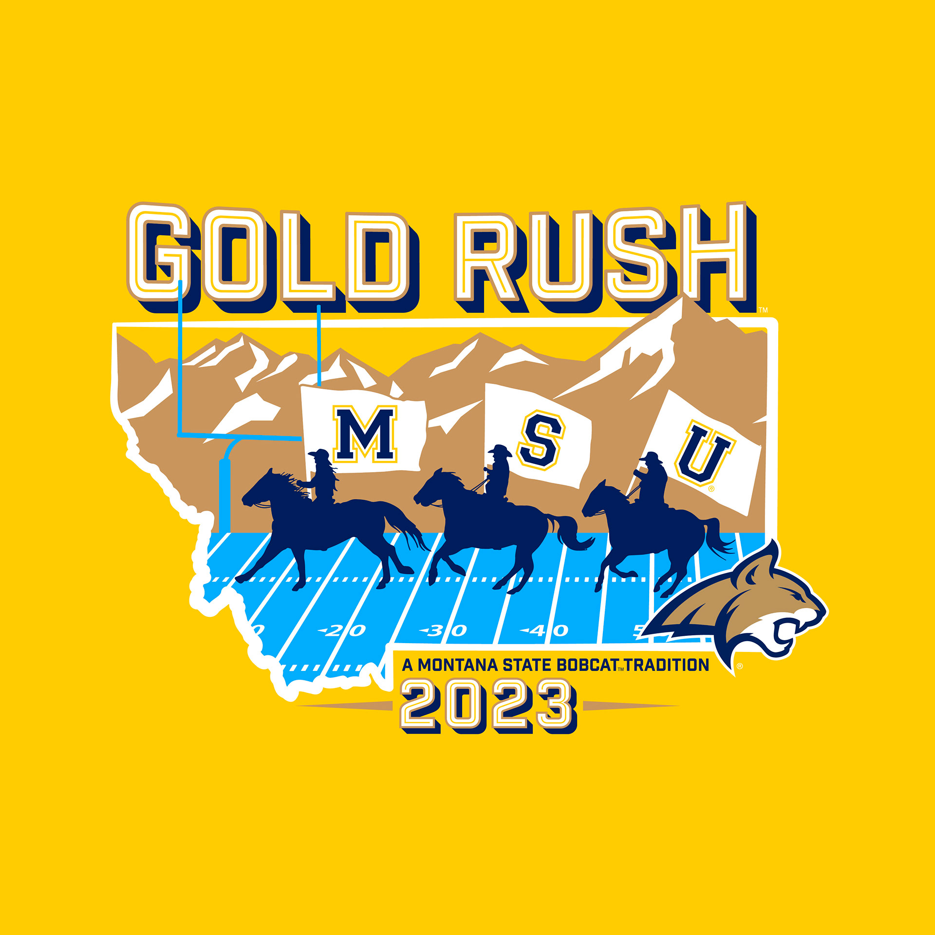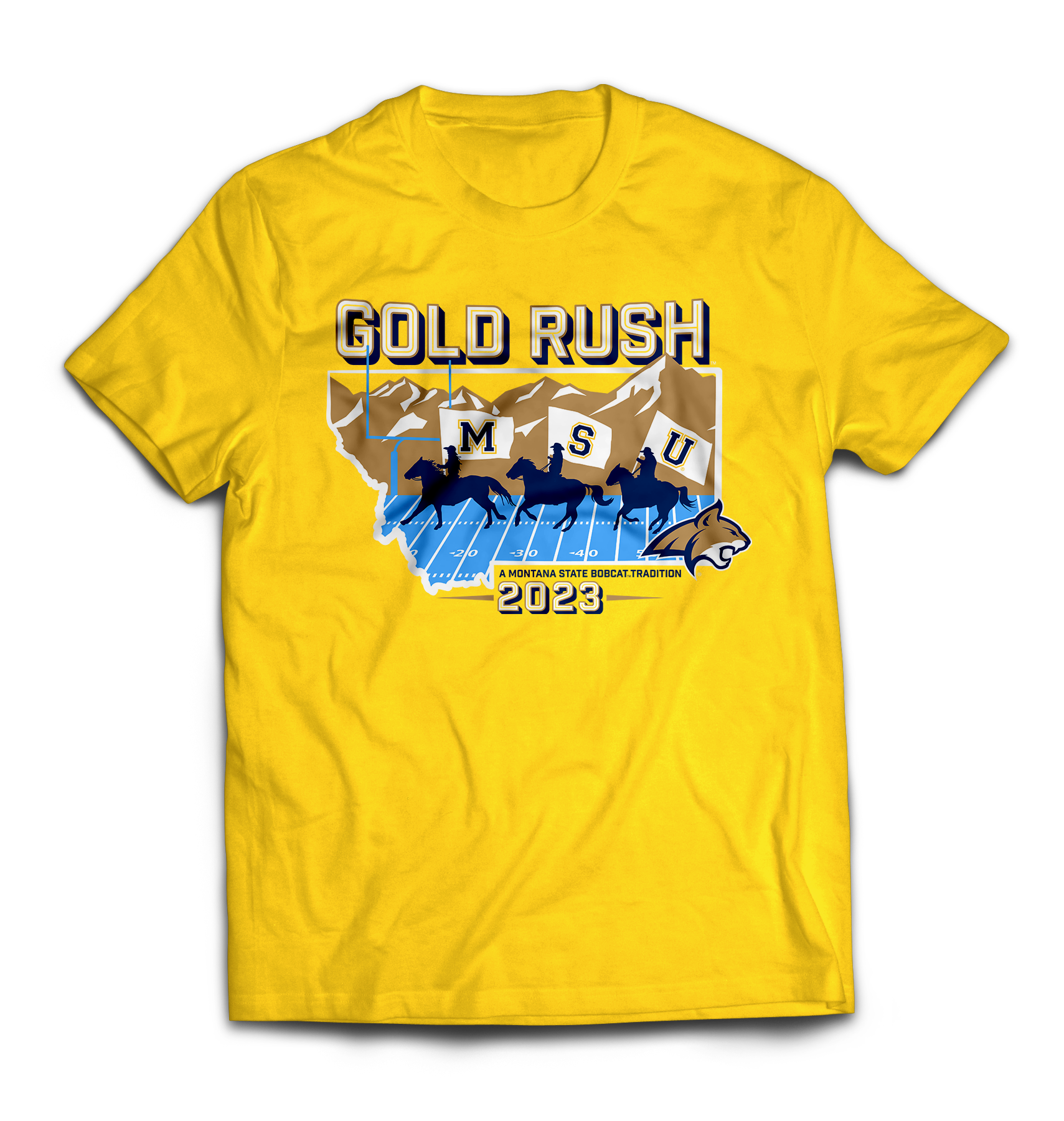 My winning artwork for the 2023 Gold Rush T-shirt design contest. The design depicts the rodeo team's opening runout and represents our cowboy roots here in Montana. Over 15,000 shirts were sold to eager fans ready to pack the stadium with gold.