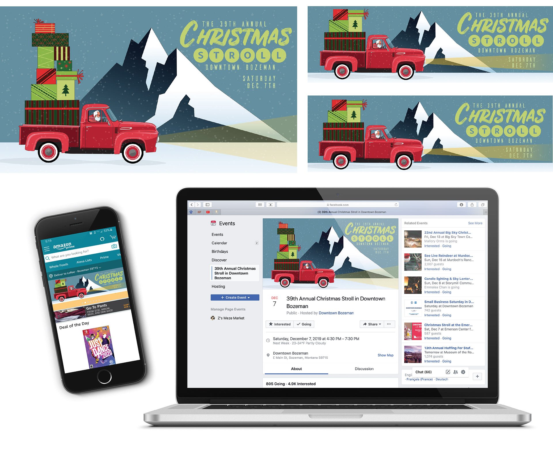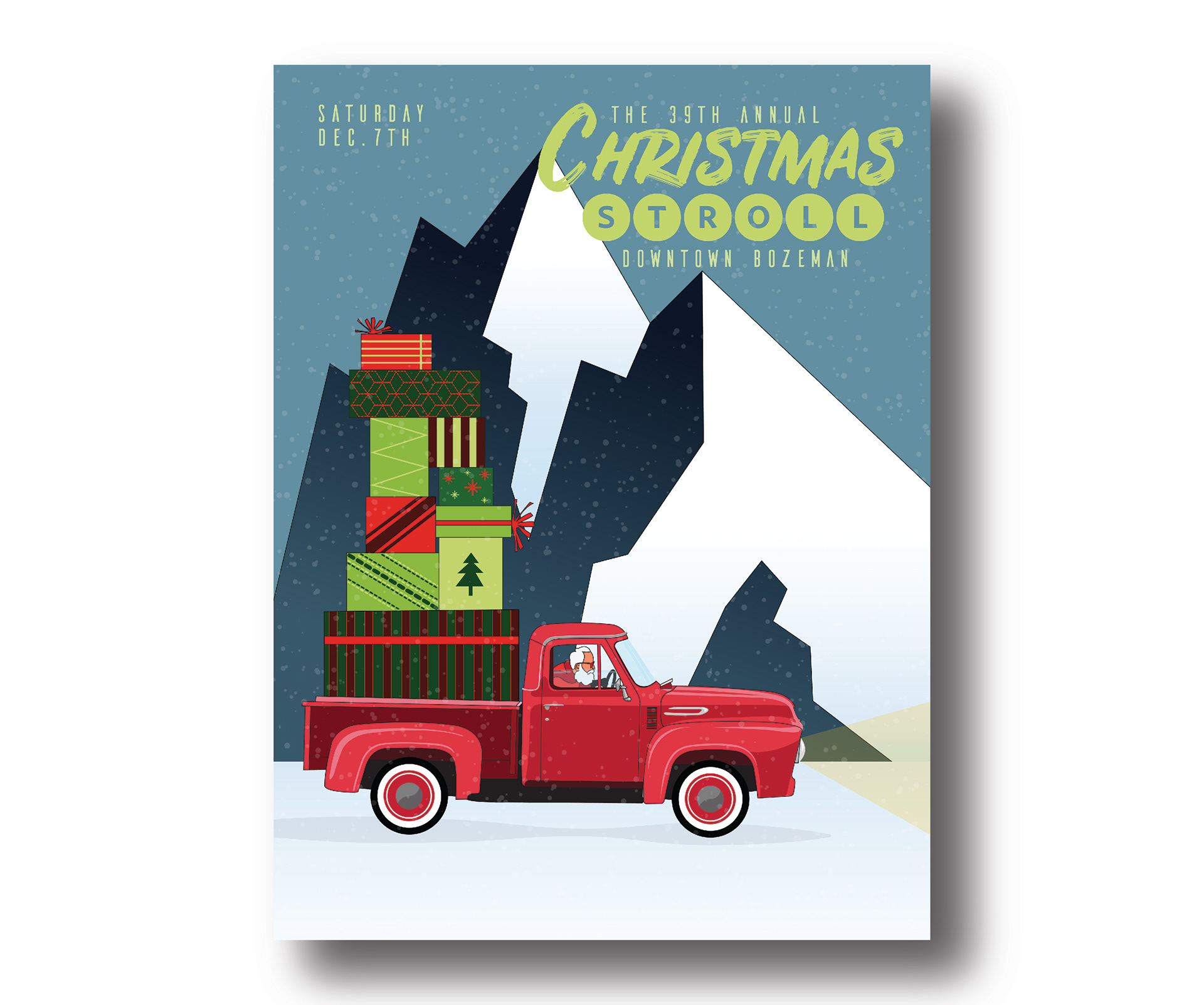 My poster entry chosen to represent the 2019 Christmas Stroll in Bozeman Montana. Formats include event ads, banner ads, poster, and facebook profile display.