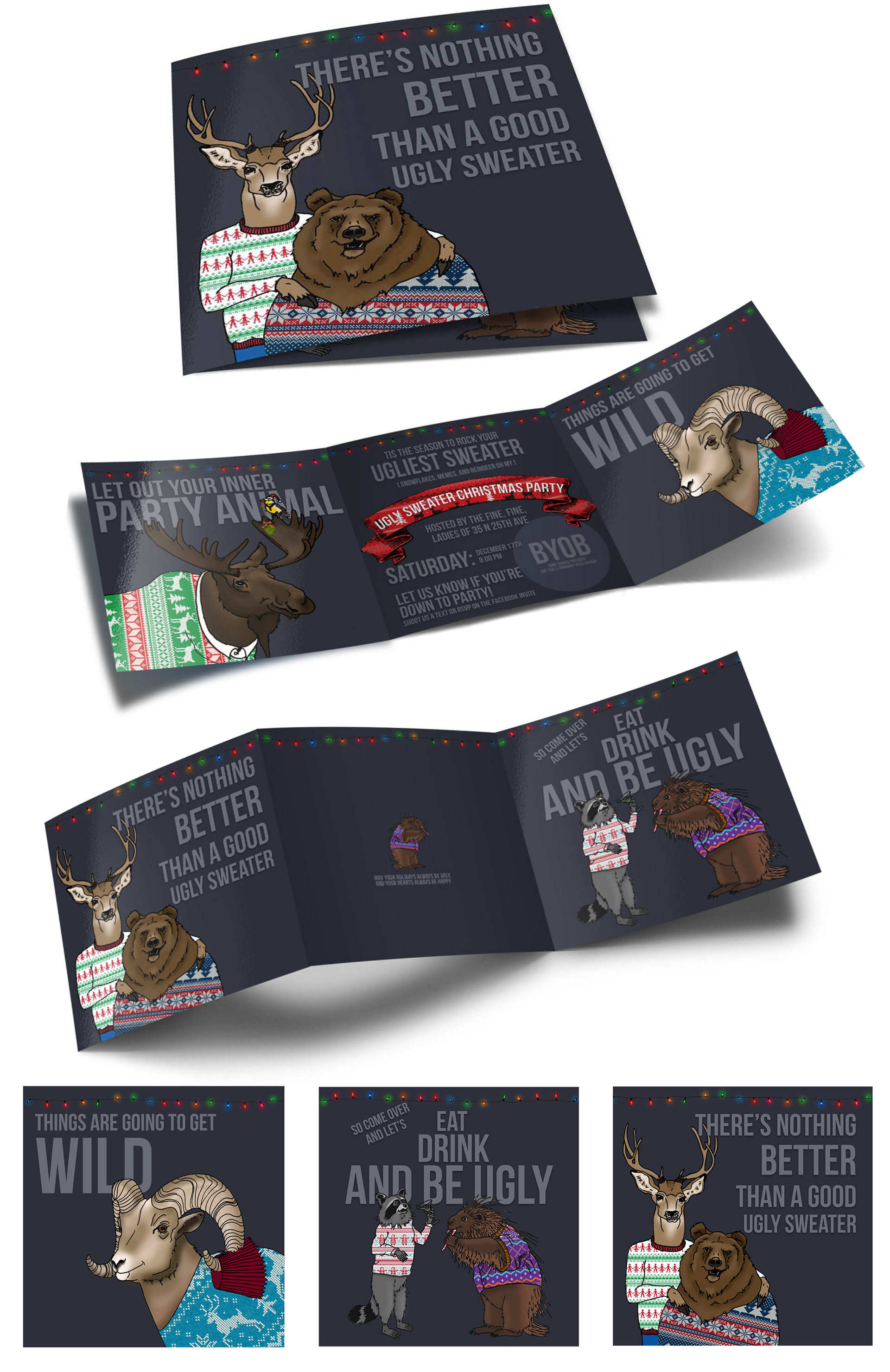 A fun, decorative, Christmas party invite designed to get party goers excited about what can be a dreary time of year.